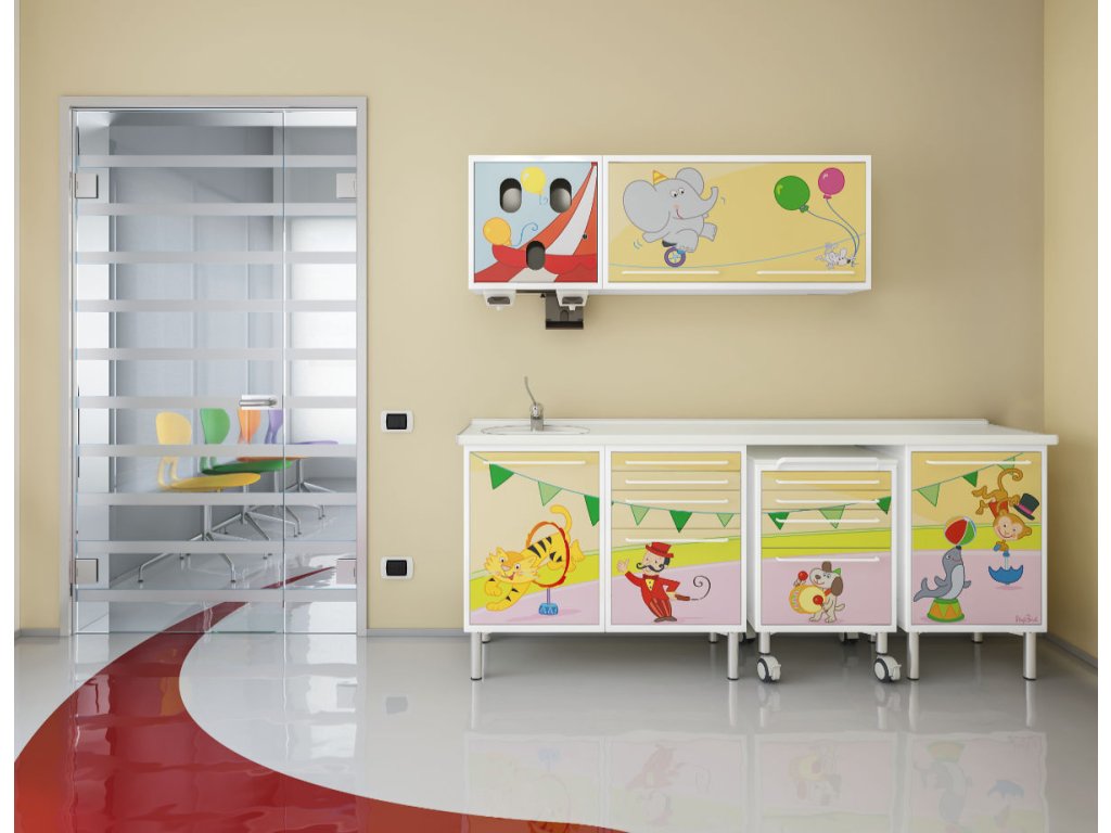 Táto kompozícia je charakterizovaná farebnými kresbami na dvierkach, zhromažďuje všetky najlepšie prvky profesionálnej praxe v redukovanom priestore: jednotky zavesené od podlahy, keramický drez, batéria s klinickou pákou, mobilná jednotka. Závesná jednotka je vybavená dávkovačom jednorazových materiálov, dávkovačom mydla a obrúskov: všetko pre zaručenie najlepšej hygieny.