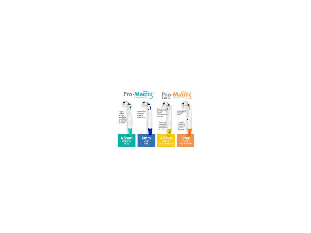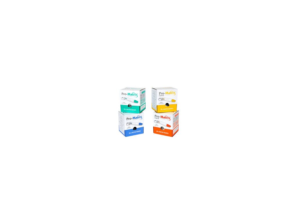 Univerzálny jednorazový matricový systém na použitie pri kompozitných i amalgámových rekonštrukciách. Balenie: 50 ks. Zelené 4,5mm - úzke; Modré 6mm - široké; Žlté 4,5mm - úzke oblé; Oranžové 6mm - široké oblé