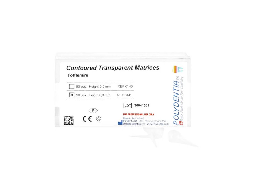 Anatomicky predtvarované a konturované transparentné matrice. Hrúbka 0,075mm. Balenie 50ks. Rôzne šírky.